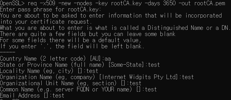 >> req -config C:\OpenSSL\bin\openssl.cnf -x509 -new -nodes -key rootCA.key -days 3650 -out rootCA.pem