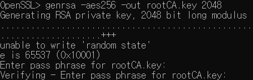 4. CRT 생성 (키 생성) genrsa -aes256 -out rootCA.key 2048