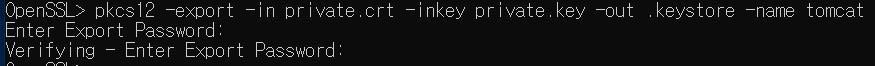>> pkcs12 -export -in private.crt -inkey private.key -out .keystore -name tomcat
