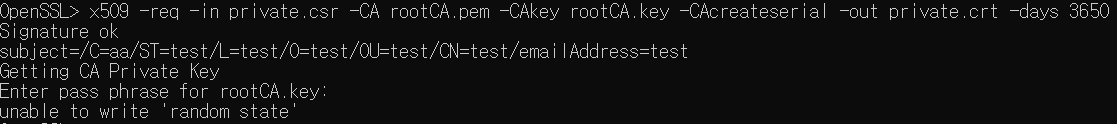 6. CRT 생성 (CRT 생성) x509 -req -in private.csr -CA rootCA.pem -CAkey rootCA.key -CAcreateserial -out private.crt -days 3650