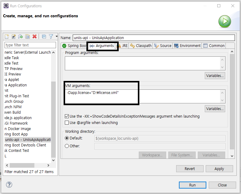 2. Arguments 탭 > VM arguments 내 작성